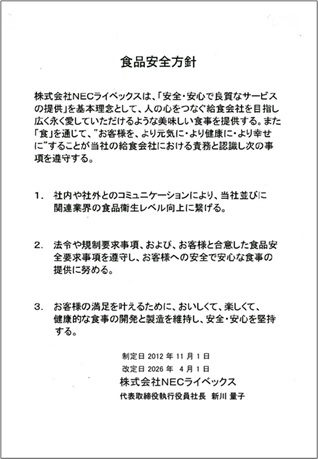 ISO 22000認証をフードサービス事業部(食品衛生管理部、仕入部、第一部、NEC本社ビル食堂)にて取得(2013年3月28日)